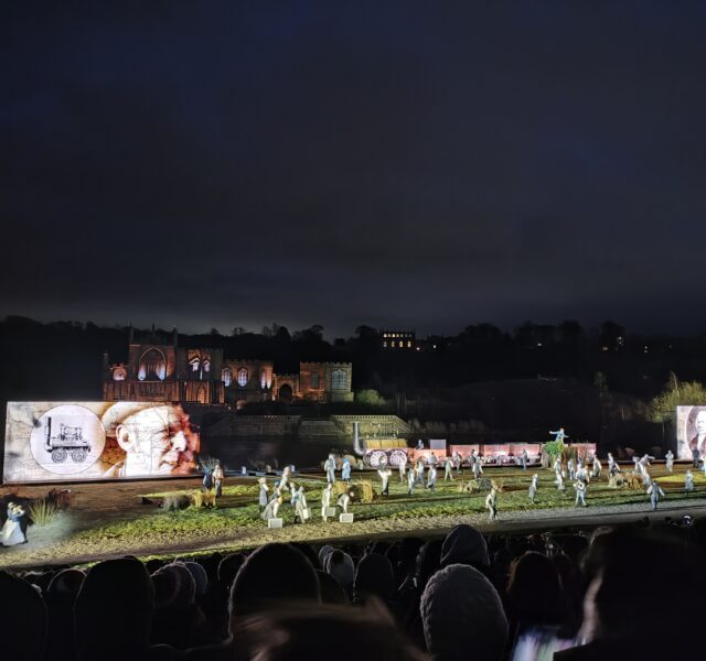 All Change! took place at the permanent location of Kynren in Bishop Auckland, where a pageant of British history is regularly held, making a grand setting for the performance. The Infant Hercules male voice choir opened the show as the sun set, cutting through the wind to bring us traditional songs from the area. Once the sun went down, a first-person narrative began with an elderly woman speaking about her experience as the first traveller on the SDR. A screen at each side of the stage flanked performers enacting the narrative, meanwhile a railway track ran behind the screens, so a full-sized replica of Locomotion No.1 could emerge from the projections.